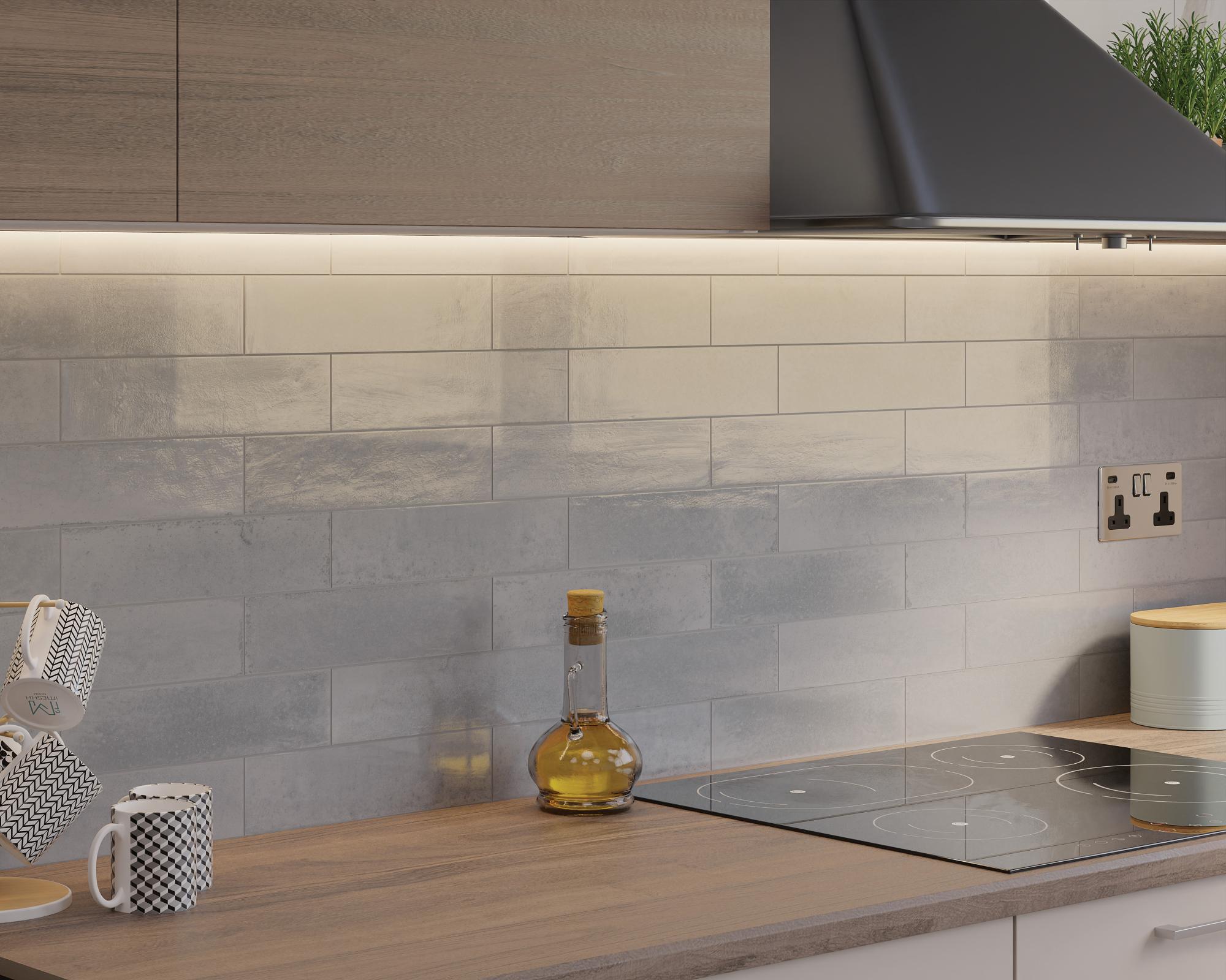 Azulejo porcelánico, formato 7×28 cm, en una tonalidad gris con acabado ultragloss y aspecto destonificado.