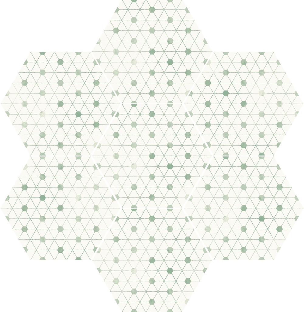 Baldosa hexagonal de porcelánico en 21,5×25. Delicada decoración en tono aguamarina sobre fondo hueso y efectos desgastados, ideal para crear alfombras en el suelo o destacar ciertas áreas de la pared.