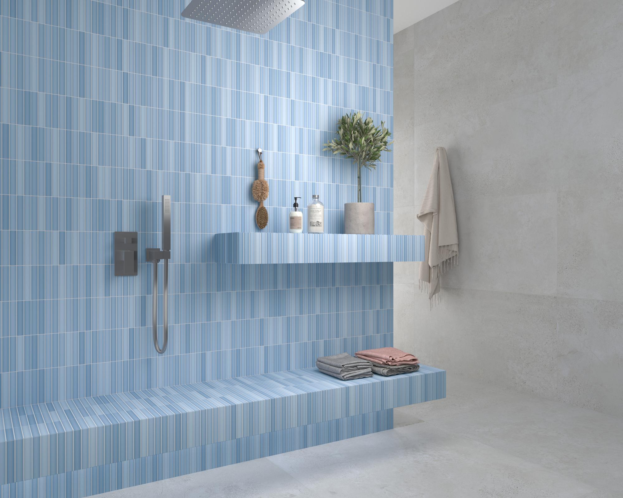 Azulejo porcelánico de 11.5×23.1cm acabado en una tonalidad azul cielo ideal para crear un rincón de serenidad, paz y armonía. También un spa relajante en zonas de baño y/o piscinas.